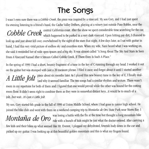 Cobble Creek is Neil's second album to exclusively feature his own compositions. The pieces are arranged in an order that might represent an accompaniment to your day. You find yourself waking to the gentle stirrings of Cobble Creek, continuing through everyday events and moods, winding down with dinner and a movie, and capping it off with a quiet lullaby.