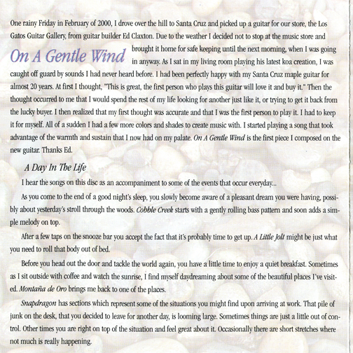 Another factor in the whole thing was meeting a great builder in Santa Cruz, Ed Claxton. After many years with my trusty Santa Cruz guitar, I found room in my life for a 2nd guitar, which quickly became my 1st guitar. Ed's guitar really gave me a broader range of sounds to create music. I felt like a painter who had just been handed a huge pallet and turned loose.